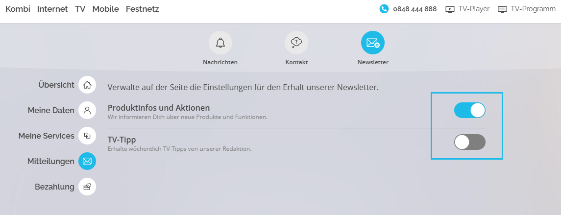 Melde dich bei deinem Teleboy-Konto an und navigiere zu den Einstellungen für Mitteilungen unter folgendem Link: https://my.teleboy.ch/notifications/newsletter.