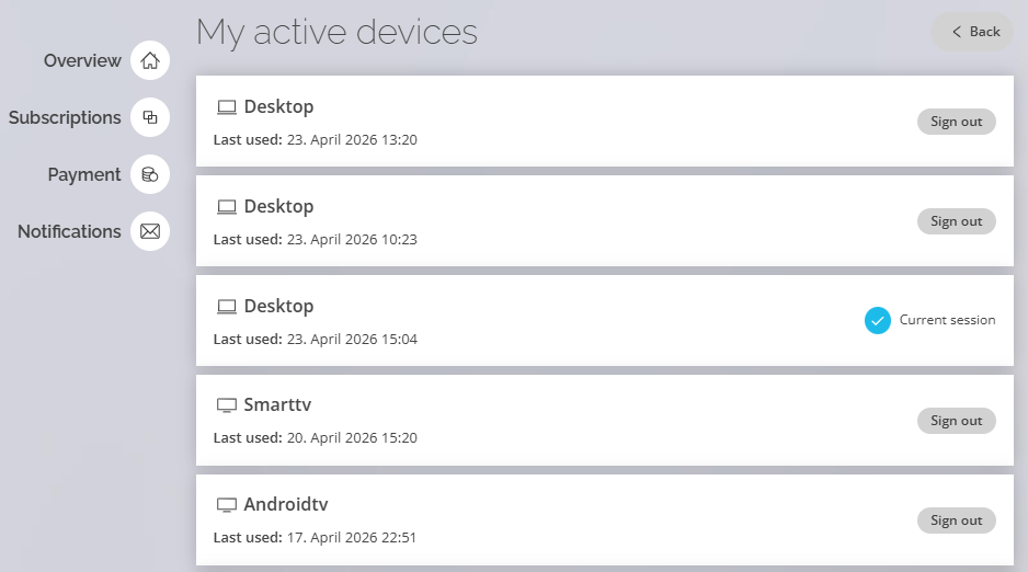 The list shows all sessions where you are logged in with your Teleboy account: desktop browsers, Smart TV and Android TV – each with the date of last use.
