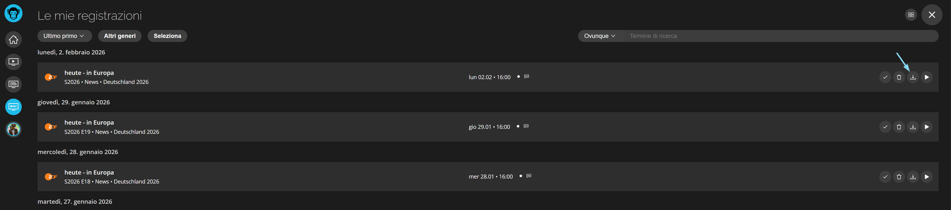 - Clicca sull'icona di download (una freccia rivolta verso il basso) per scaricare la registrazione.